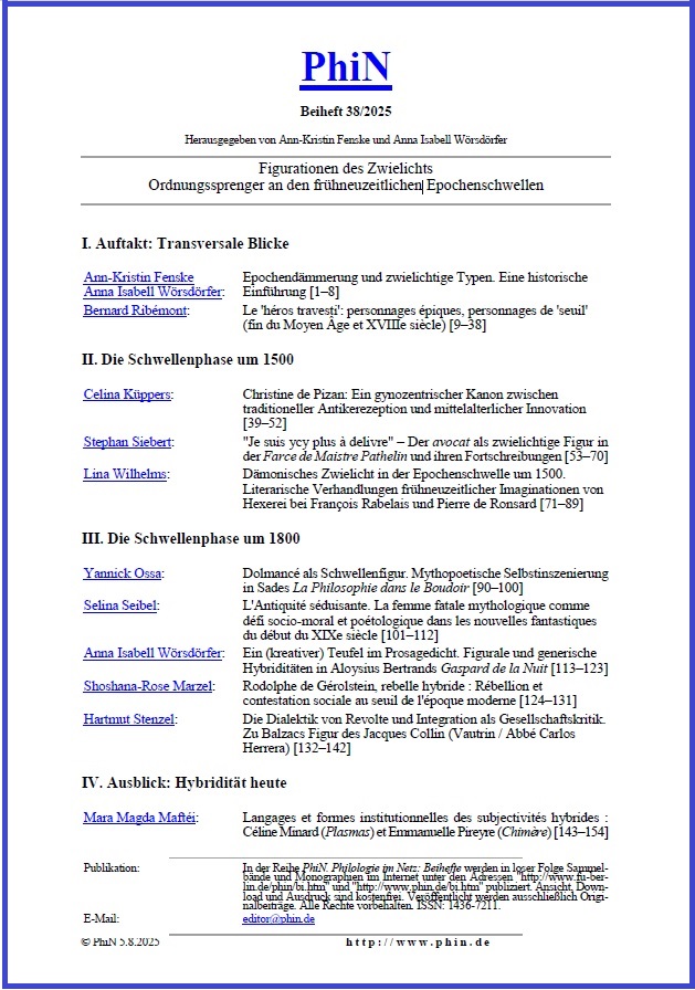 03. (gemeinsam mit Ann-Kristik Fenske) (Hg.): Fiurationen des Zwielichts. Ordnungssprenger an den frühneuzeitlichen Epochenschwellen. Tagungsakten der Sektion 4 des XIV. Kongresses des deutschen Frankoromanistenverbandes „Zusammenflüsse: Kreuzungen und Konvergenzen“, zugleich PhiN-Beiheft 38 (2025).
